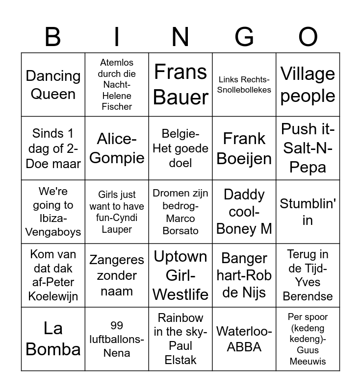 This bingo card has 45 words: Ich bin wie du-Marianne Rosenberg, Dromen zijn bedrog-Marco Borsato, Why tell me why-Anita Meyer, La Bomba, Ding dong song, Waterloo-ABBA, Frans Bauer, Eye of the tiger, Village people, 99 luftballons-Nena, Links Rechts-Snollebollekes, Daddy cool-Boney M, Uptown Girl-Westlife, Zangeres zonder naam, Leef-André Hazes jr., Rainbow in the sky-Paul Elstak, Rolling in the deep-Adele, We're going to Ibiza-Vengaboys, Man! I feel like a woman!-Shania Twain, Push it-Salt-N-Pepa, Atemlos durch die Nacht-Helene Fischer, Believe, Total Eclipse of the Heart, Dancing Queen, No Limit, Stumblin' in, Shape of you-Ed Sheeran, Dancing in the dark-Bruce Springsteen, Banger hart-Rob de Nijs, Kom van dat dak af-Peter Koelewijn, Amalia-Wesly Bronkhorst, Terug in de Tijd-Yves Berendse, I'm so excited-The pointer sisters, Paloma Blanca-George Baker, Het is een nacht, Girls just want to have fun-Cyndi Lauper, Que Si, Que no-Jody Bernal, Rio, Per spoor (kedeng kedeng)-Guus Meeuwis, Belgie-Het goede doel, Sinds 1 dag of 2-Doe maar, Frank Boeijen, Verdammt ich lieb' dich, Alice-Gompie and Goldband.