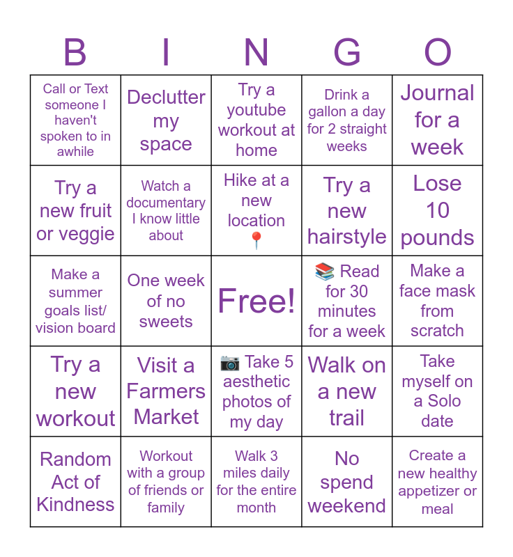 This bingo card has a free space and 24 words: Visit a Farmers Market, Workout with a group of friends or family, Hike at a new location📍, Random Act of Kindness, Journal for a week, Call or Text someone I haven't spoken to in awhile, Try a new fruit or veggie, Declutter my space, 📚 Read for 30 minutes for a week, 📷 Take 5 aesthetic photos of my day, Try a new hairstyle, Make a summer goals list/ vision board, Walk on a new trail, Take myself on a Solo date, Watch a documentary I know little about, No spend weekend, Make a face mask from scratch, Try a youtube workout at home, Lose 10 pounds, One week of no sweets, Create a new healthy appetizer or meal, Try a new workout, Drink a gallon a day for 2 straight weeks and Walk 3 miles daily for the entire month.
