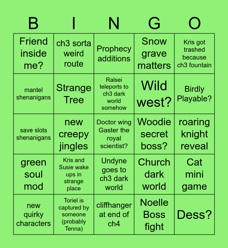 This bingo card has a free space and 24 words: Kris and Susie wake ups in strange place, Toriel is captured by someone (probably Tenna), Ralsei teleports to ch3 dark world somehow, new quirky characters, Kris got trashed because ch3 fountain, Friend inside me?, mantel shenanigans, ch3 sorta weird route, Woodie secret boss?, Undyne goes to ch3 dark world, Wild west?, save slots shenanigans, Church dark world, Cat mini game, Strange Tree, Noelle Boss fight, roaring knight reveal, Prophecy additions, Birdly Playable?, new creepy jingles, Dess?, green soul mod, Snow grave matters and cliffhanger at end of ch4.