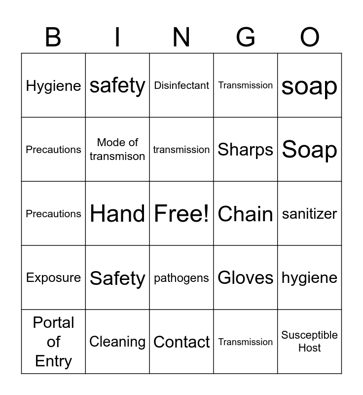 This bingo card has a free space and 65 words: infection, precautions, hand, hygiene, PPE, sharps, safety, exposure, transmission, HAI, pathogens, antibiotic, sanitizer, soap, Infection, Precautions, Hand, Hygiene, PPE, Sharps, Safety, Exposure, Transmission, HAI, Infection, Germs, Standard, Precautions, Susceptible Host, Procedure, Portal of Entry, Hand Hygine, Causative agent, Portal of exit, Gloves, Cleaning, Reservoir, Precautions, Transmission, Disinfection, Mode of transmison, Wash, Chain, Pathogens, Personal Protective Equipment, Sanitizer, Soap, Friction, Soiled, Contaminated, Direct Contact, Surfaces, Cleaning, Contact, Gloves, Donning, Doffing, Disinfectant, Time, Masks, Infection, Disposal, Waste, Blood and Chain.