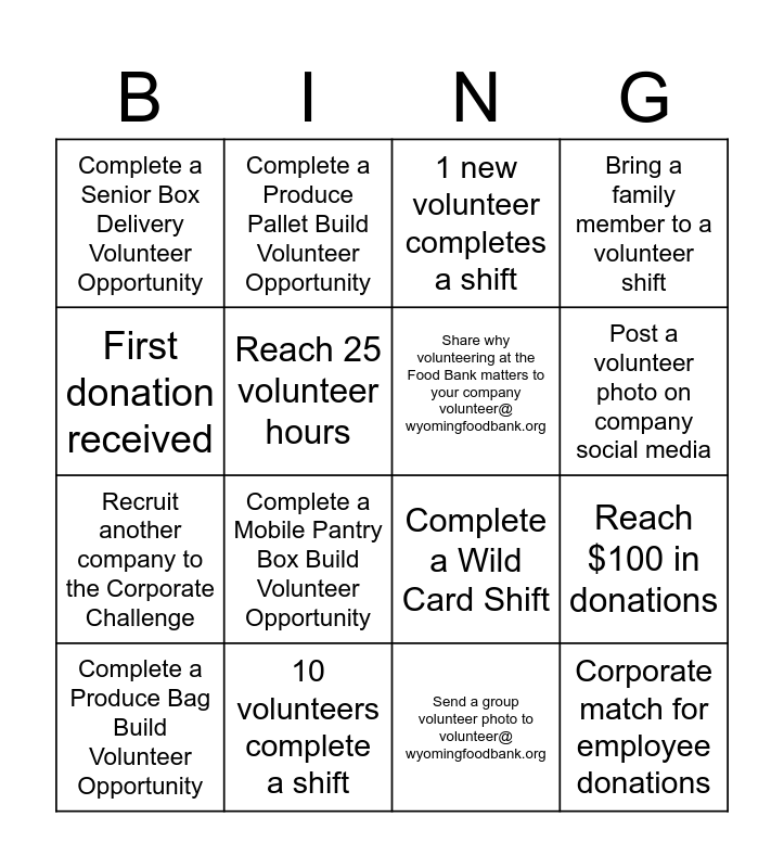 This bingo card has 16 words: 10 volunteers complete a shift, Reach $100 in donations, 1 new volunteer completes a shift, Complete a Senior Box Delivery Volunteer Opportunity, Recruit another company to the Corporate Challenge, Complete a Produce Pallet Build Volunteer Opportunity, Complete a Wild Card Shift, Send a group volunteer photo to volunteer@ wyomingfoodbank.org, First donation received, Reach 25 volunteer hours, Complete a Produce Bag Build Volunteer Opportunity, Bring a family member to a volunteer shift, Complete a Mobile Pantry Box Build Volunteer Opportunity, Post a volunteer photo on company social media, Share why volunteering at the Food Bank matters to your company volunteer@ wyomingfoodbank.org and Corporate match for employee donations.