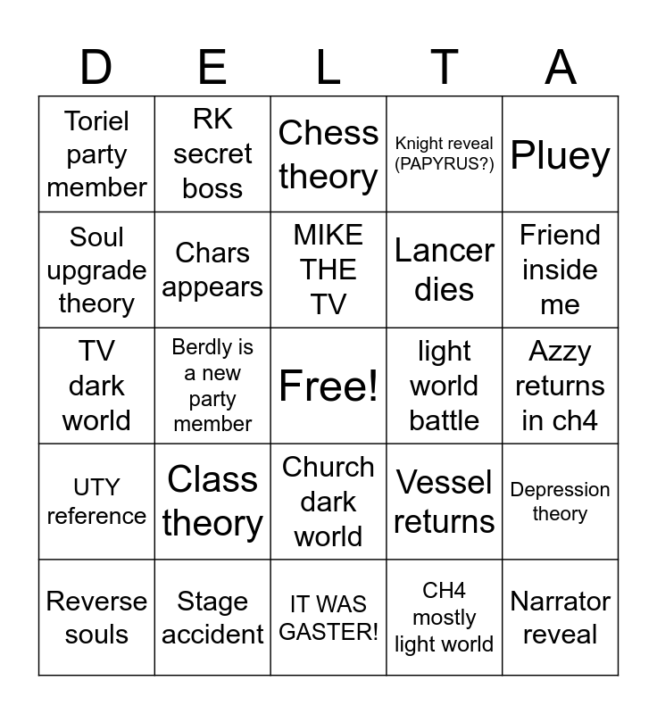 This bingo card has a free space and 24 words: Class theory, Stage accident, MIKE THE TV, Reverse souls, Pluey, Toriel party member, Soul upgrade theory, RK secret boss, light world battle, Church dark world, Lancer dies, TV dark world, Vessel returns, Depression theory, Chars appears, CH4 mostly light world, Azzy returns in ch4, Chess theory, Friend inside me, Berdly is a new party member, Narrator reveal, UTY reference, Knight reveal (PAPYRUS?) and IT WAS GASTER!.