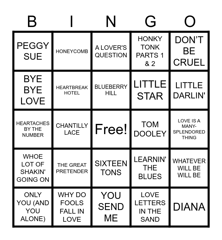 This bingo card has a free space and 77 words: (LET ME BE YOUR) TEDDY BEAR, (WE'RE GONN) ROCK AROUND THE CLOCK, A LOVER'S QUESTION, AIN'T THAT A SHAME, ALL I HAVE TO DO IS DREAM, ALL SHOOK UP, ALLEGHENY MOON, AT THE HOP, AUTUMN LEAVES, BAND OF GOLD, BE-BOP BABY, BLUE SUEDE SHOES, BLUEBERRY HILL, BYE BYE LOVE, CHANCES ARE, CHANTILLY LACE, COME GO WITH ME, DIANA, DON’T, DON’T BE CRUEL, DONNA, HEARTACHES BY THE NUMBER, HEARTBREAK HOTEL, HONEYCOMB, HONKY TONK PARTS 1 & 2, HOT DIGGITY (DOG ZIGGITY BOOM), I HEAR YOU KNOCKING, I WANT YOU, I NEED YOU, I LOVE YOU, IT'S ALL IN THE GAME, IT'S ONLY MAKE BELIEVE, JAILHOUSE ROCK, JUST WALKIN' IN THE RAIN, LA BAMBA, LEARNIN' THE BLUES, LITTLE DARLIN', LITTLE STAR, LOLLIPOP, LONELY BOY, LOVE IS A MANY-SPLENDORED THING, LOVE LETTERS IN THE SAND, LOVE ME TENDER, MACK THE KNIFE, MEMORIES ARE MADE OF THIS, MOMENTS TO REMEMBER, MR. BLUE, MY PRAYER, ONLY YOU (AND YOU ALONE), PEGGY SUE, SEARCHIN', SILHOUETTES, SINGING THE BLUES, SIXTEEN TONS, SMOKE GETS IN YOUR EYES, SO RARE, STAGGER LEE, STANDING ON THE CORNER, SUGARTIME, TAMMY, TEQUILA, THE BATTLE OF NEW ORLEANS, THE GREAT PRETENDER, THE GREEN DOOR, THE ROCK AND ROLL WALTZ, THE STROLL, THE WAYWARD WIND, THE YELLOW ROSE OF TEXAS, TO KNOW HIM IS TO LOVE HIM, TOM DOOLEY, TRUE LOVE, VENUS, WAKE UP LITTLE SUSIE, WHATEVER WILL BE WILL BE, WHOE LOT OF SHAKIN' GOING ON, WHY DO FOOLS FALL IN LOVE, WITCH DOCTOR, YOU SEND ME and YOUNG LOVE.
