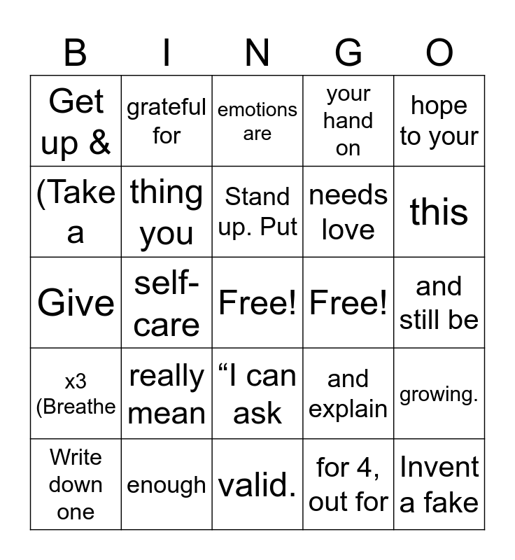 This bingo card has a free space and 124 words: Dance for 10, seconds like, no one’s, watching. 💃, 🕺, Deep Breaths, x3 (Breathe, in for 4, hold, for 4, out for, 4.), Name one, boundary, you've learned, to set, and why, it matters., "I am, enough, exactly as I, am., " (Say it, out loud.), Give, someone in, the room a, compliment., Stand up. Put, your hand on, your heart. Say:, ‘I’m still here., I’m still, growing., What does, self-care, really mean, to you?, Mental, Health Truth:, “Healing isn’t, linear., ”, Get up &, stretch for 30, seconds., (Body check-, in.), Write a, message of, hope to your, future self., Do 5, jumping, jacks., (Shake off, the tension.), Turn to, someone near, you and ask:, 'How’s your, heart today?, Free!, (Take a, mindful, pause), Share one, song that, lifts your, mood. 🎶, “I can ask, for help, and still be, strong., ”, “Progress,, not, perfection., ”, (Say it + feel, it.), What’s your, favorite, coping tool?, (Share with, someone.), Write down one, thing you, forgive yourself, for. Fold it., Keep it. Or let it, go., Describe, your safe, space—real, or imagined., “My, emotions are, valid., ” (Say it, like you, mean it.), Invent a fake, therapy animal, and explain, how it helps, your mental, health., One small, win from, this, week?, Name one, person who, supports, your mental, health., Make a heart, with your, hands. Look, around. Who, needs love, today? ❤, List 3 things, you’re, grateful for and today..