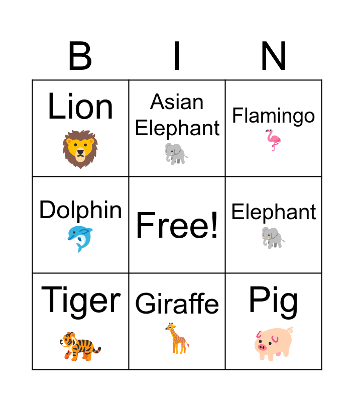 This bingo card has a free space and 8 words: Elephant🐘, Flamingo🦩, Asian Elephant🐘, Tiger🐅, Lion🦁, Pig🐖, Dolphin🐬 and Giraffe🦒.
