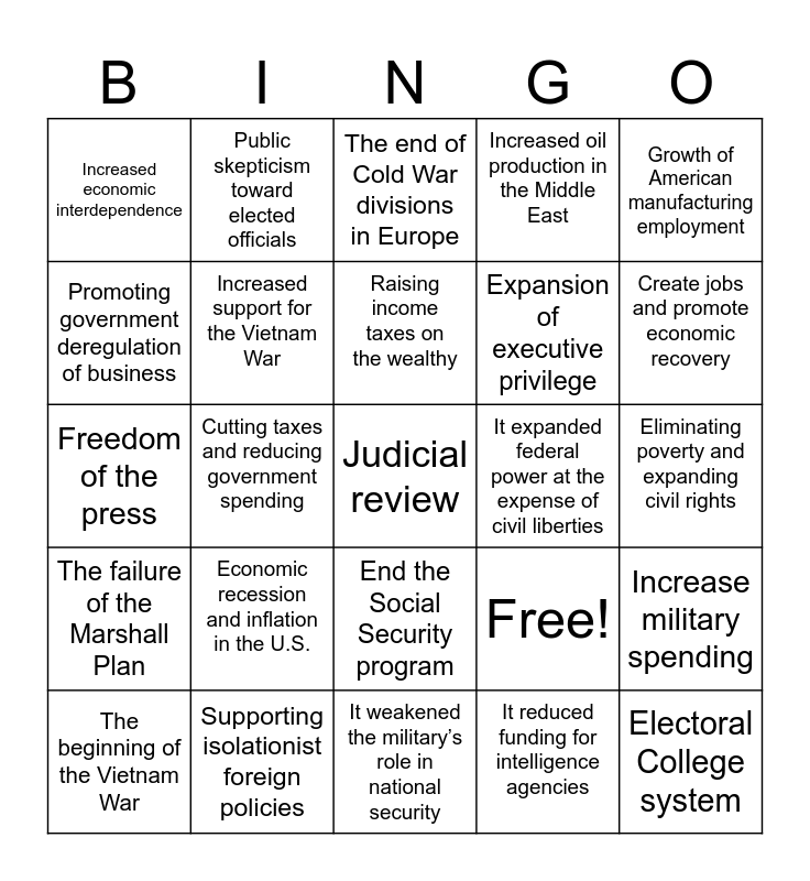 This bingo card has 25 words: Economic recession and inflation in the U.S., It weakened the military’s role in national security, Raising income taxes on the wealthy, The beginning of the Vietnam War, Growth of American manufacturing employment, Increased economic interdependence, Promoting government deregulation of business, Public skepticism toward elected officials, It expanded federal power at the expense of civil liberties, End the Social Security program, Expansion of executive privilege, Freedom of the press, Free!, Increase military spending, Increased support for the Vietnam War, Electoral College system, Eliminating poverty and expanding civil rights, The end of Cold War divisions in Europe, Create jobs and promote economic recovery, Cutting taxes and reducing government spending, Judicial review, Supporting isolationist foreign policies, The failure of the Marshall Plan, Increased oil production in the Middle East and It reduced funding for intelligence agencies.