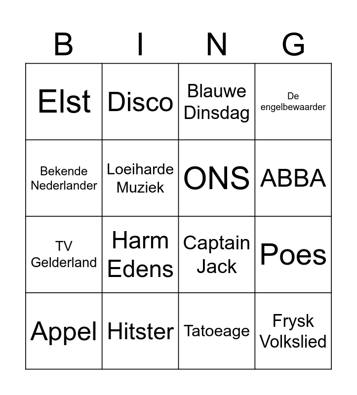 This bingo card has 16 words: Hitster, Poes, Blauwe Dinsdag, Elst, TV Gelderland, Disco, Captain Jack, Tatoeage, Bekende Nederlander, Loeiharde Muziek, Appel, De engelbewaarder, Harm Edens, ABBA, ONS and Frysk Volkslied.