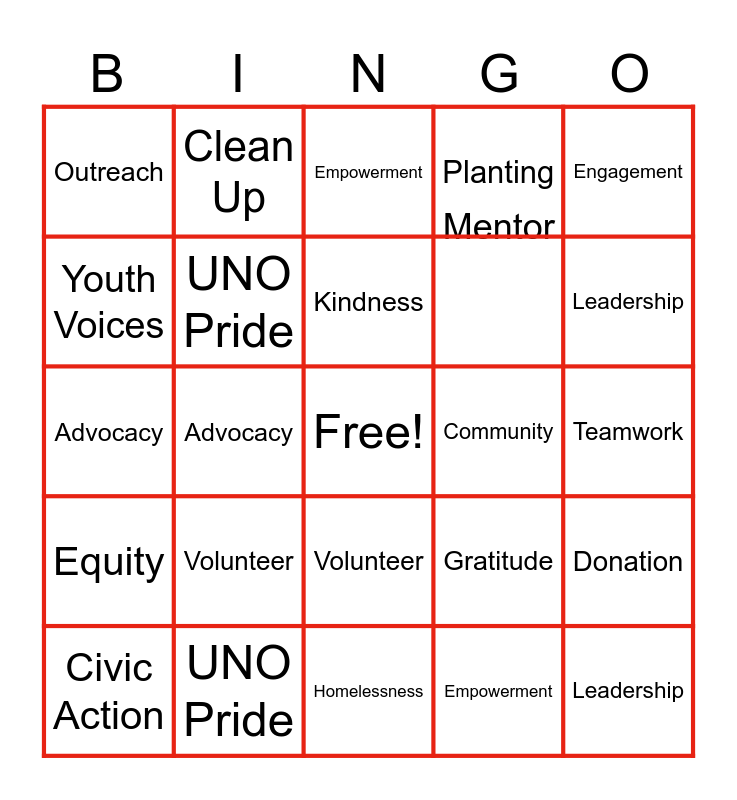 This bingo card has a free space and 49 words: Food Pantry, Leadership, Civic Action, Homelessness, Volunteer, Equity, Clean Up, Public Art, Youth Voices, Service, UNO Pride, Planting, Donation, Gratitude, Teamwork, Nonprofit, Kindness, Community, Bingo Win, Engagement, Advocacy, Empowerment, Outreach, Mentor, Food Pantry, Leadership, Civic Action, Homelessness, Volunteer, Equity, Clean Up, Public Art, Youth Voices, Service, UNO Pride, Planting, Donation, Gratitude, Teamwork, Nonprofit, Kindness, Community, Bingo Win, Engagement, Advocacy, Empowerment, Outreach, Mentor and unity.