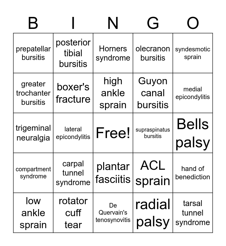 This bingo card has a free space and 24 words: carpal tunnel syndrome, rotator cuff tear, high ankle sprain, low ankle sprain, syndesmotic sprain, prepatellar bursitis, greater trochanter bursitis, posterior tibial bursitis, supraspinatus bursitis, plantar fasciitis, Guyon canal bursitis, trigeminal neuralgia, ACL sprain, hand of benediction, boxer's fracture, radial palsy, Bells palsy, Horners syndrome, medial epicondylitis, lateral epicondylitis, tarsal tunnel syndrome, compartment syndrome, olecranon bursitis and De Quervain's tenosynovitis.