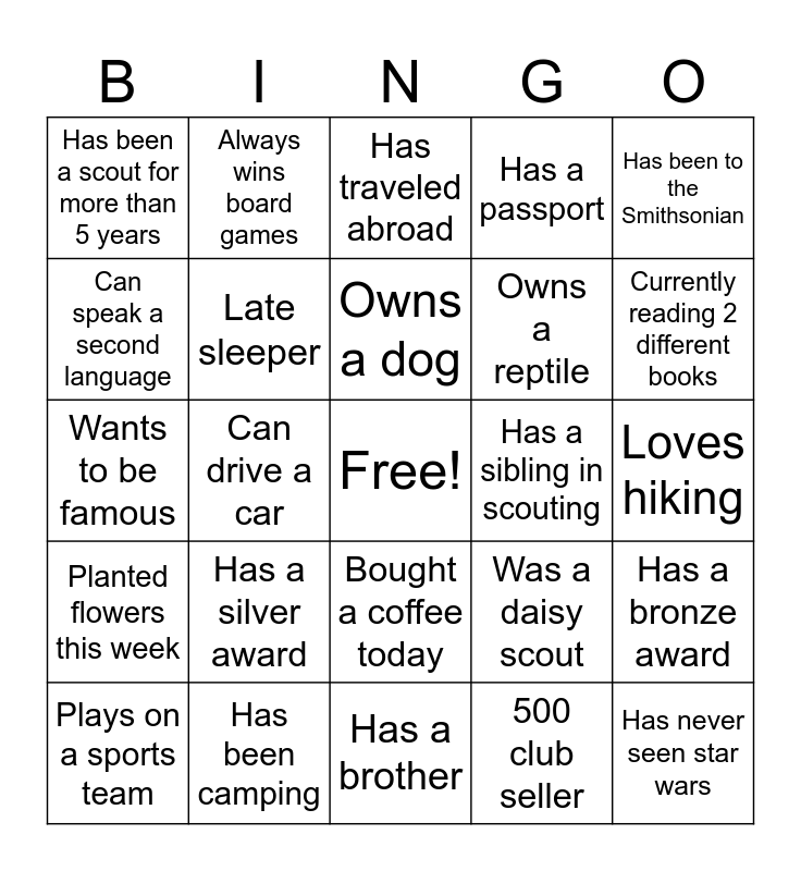 This bingo card has a free space and 24 words: Has a silver award, Has been camping, Owns a dog, Plays on a sports team, Has been to the Smithsonian, Has been a scout for more than 5 years, Can speak a second language, Always wins board games, Has a sibling in scouting, Bought a coffee today, Owns a reptile, Wants to be famous, Was a daisy scout, Has a bronze award, Late sleeper, 500 club seller, Loves hiking, Has traveled abroad, Currently reading 2 different books, Can drive a car, Has never seen star wars, Planted flowers this week, Has a passport and Has a brother.