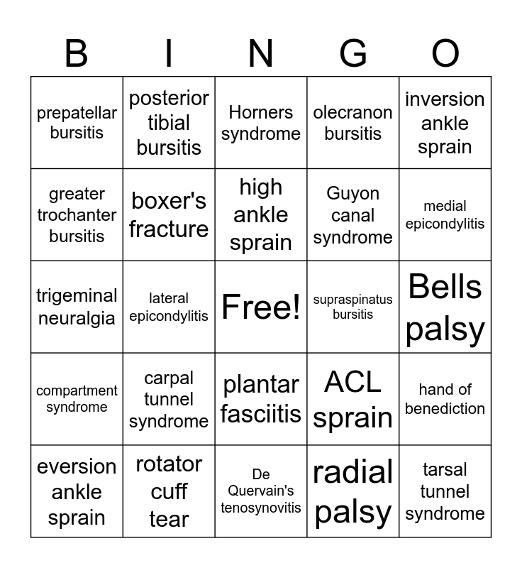 This bingo card has a free space and 24 words: carpal tunnel syndrome, rotator cuff tear, high ankle sprain, eversion ankle sprain, inversion ankle sprain, prepatellar bursitis, greater trochanter bursitis, posterior tibial bursitis, supraspinatus bursitis, plantar fasciitis, Guyon canal syndrome, trigeminal neuralgia, ACL sprain, hand of benediction, boxer's fracture, radial palsy, Bells palsy, Horners syndrome, medial epicondylitis, lateral epicondylitis, tarsal tunnel syndrome, compartment syndrome, olecranon bursitis and De Quervain's tenosynovitis.