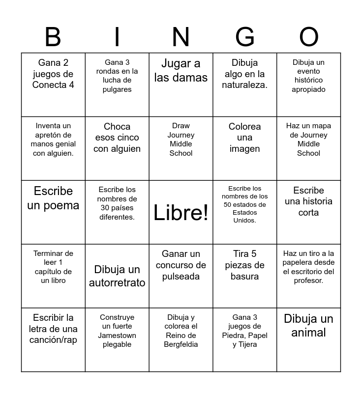 This bingo card has a free space and 24 words: Dibuja un autorretrato, Construye un fuerte Jamestown plegable, Draw Journey Middle School, Escribir la letra de una canción/rap, Dibuja un evento histórico apropiado, Gana 2 juegos de Conecta 4, Inventa un apretón de manos genial con alguien., Gana 3 rondas en la lucha de pulgares, Escribe los nombres de los 50 estados de Estados Unidos., Ganar un concurso de pulseada, Colorea una imagen, Escribe un poema, Tira 5 piezas de basura, Haz un tiro a la papelera desde el escritorio del profesor., Choca esos cinco con alguien, Gana 3 juegos de Piedra, Papel y Tijera, Escribe una historia corta, Jugar a las damas, Haz un mapa de Journey Middle School, Escribe los nombres de 30 países diferentes., Dibuja un animal, Terminar de leer 1 capítulo de un libro, Dibuja algo en la naturaleza. and Dibuja y colorea el Reino de Bergfeldia.