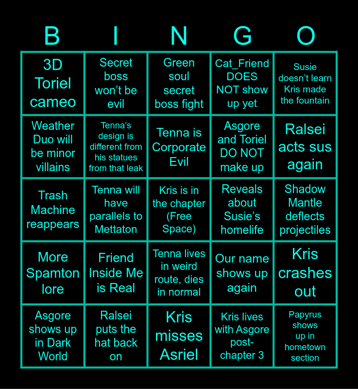 This bingo card has a free space and 24 words: Friend Inside Me is Real, Ralsei puts the hat back on, Tenna is Corporate Evil, Asgore shows up in Dark World, Susie doesn’t learn Kris made the fountain, 3D Toriel cameo, Weather Duo will be minor villains, Secret boss won’t be evil, Reveals about Susie’s homelife, Tenna lives in weird route, dies in normal, Asgore and Toriel DO NOT make up, Trash Machine reappears, Our name shows up again, Kris crashes out, Tenna’s design is different from his statues from that leak, Kris lives with Asgore post-chapter 3, Shadow Mantle deflects projectiles, Green soul secret boss fight, Ralsei acts sus again, Tenna will have parallels to Mettaton, Papyrus shows up in hometown section, More Spamton lore, Cat_Friend DOES NOT show up yet and Kris misses Asriel.