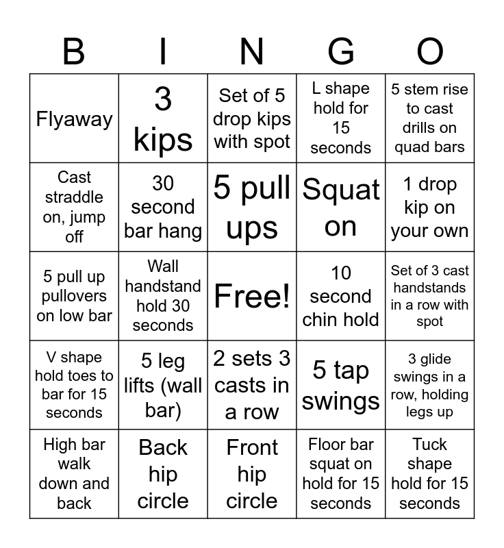 This bingo card has a free space and 25 words: 5 leg lifts (wall bar), Front hip circle, 5 pull ups, High bar walk down and back, 5 stem rise to cast drills on quad bars, Flyaway, Cast straddle on, jump off, 3 kips, 10 second chin hold, 2 sets 3 casts in a row, Squat on, 5 pull up pullovers on low bar, 5 tap swings, 3 glide swings in a row, holding legs up, 30 second bar hang, 30 second floor bar cast shape hold, Set of 3 cast handstands in a row with spot, Set of 5 drop kips with spot, 1 drop kip on your own, Wall handstand hold 30 seconds, Tuck shape hold for 15 seconds, Back hip circle, V shape hold toes to bar for 15 seconds, L shape hold for 15 seconds and Floor bar squat on hold for 15 seconds.
