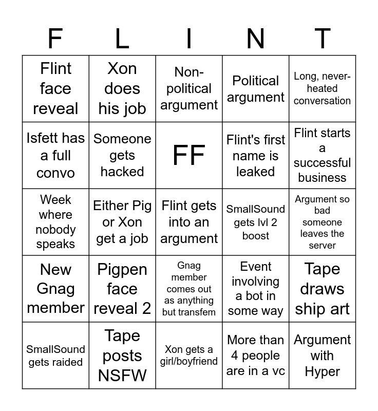This bingo card has a free space and 24 words: Pigpen face reveal 2, Tape posts NSFW, FF, SmallSound gets raided, Long, never-heated conversation, Flint face reveal, Isfett has a full convo, Xon does his job, SmallSound gets lvl 2 boost, Gnag member comes out as anything but transfem, Flint's first name is leaked, Week where nobody speaks, Event involving a bot in some way, Tape draws ship art, Someone gets hacked, More than 4 people are in a vc, Argument so bad someone leaves the server, Non-political argument, Flint starts a successful business, Either Pig or Xon get a job, Argument with Hyper, New Gnag member, Political argument and Xon gets a girl/boyfriend.