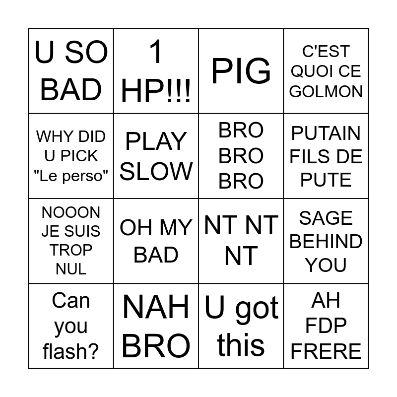 This bingo card has 16 words: NAH BRO, SAGE BEHIND YOU, PIG, U SO BAD, NOOON JE SUIS TROP NUL, 1 HP!!!, NT NT NT, U got this, WHY DID U PICK "Le perso", PLAY SLOW, Can you flash?, C'EST QUOI CE GOLMON, OH MY BAD, PUTAIN FILS DE PUTE, BRO BRO BRO and AH FDP FRERE.