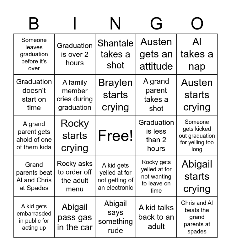 This bingo card has a free space and 24 words: Rocky asks to order off the adult menu, Abigail pass gas in the car, Braylen starts crying, A kid gets embarrasded in public for acting up, Al takes a nap, Someone leaves graduation before it's over, Graduation doesn't start on time, Graduation is over 2 hours, Graduation is less than 2 hours, A kid gets yelled at for not getting of an electronic, A grand parent takes a shot, A grand parent gets ahold of one of them kida, Rocky gets yelled at for not wanting to leave on time, Abigail starts crying, A family member cries during graduation, A kid talks back to an adult, Someone gets kicked out graduation for yelling too long, Shantale takes a shot, Austen starts crying, Rocky starts crying, Chris and Al beats the grand parents at spades, Grand parents beat Al and Chris at Spades, Austen gets an attitude and Abigail says something rude.