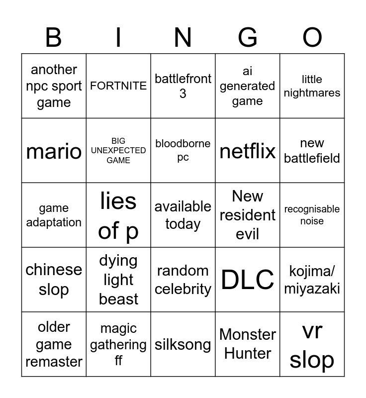This bingo card has a free space and 24 words: dying light beast, magic gathering ff, bloodborne pc, older game remaster, little nightmares, another npc sport game, mario, FORTNITE, New resident evil, random celebrity, netflix, game adaptation, DLC, kojima/ miyazaki, BIG UNEXPECTED GAME, Monster Hunter, recognisable noise, battlefront 3, new battlefield, lies of p, vr slop, chinese slop, ai generated game and silksong.