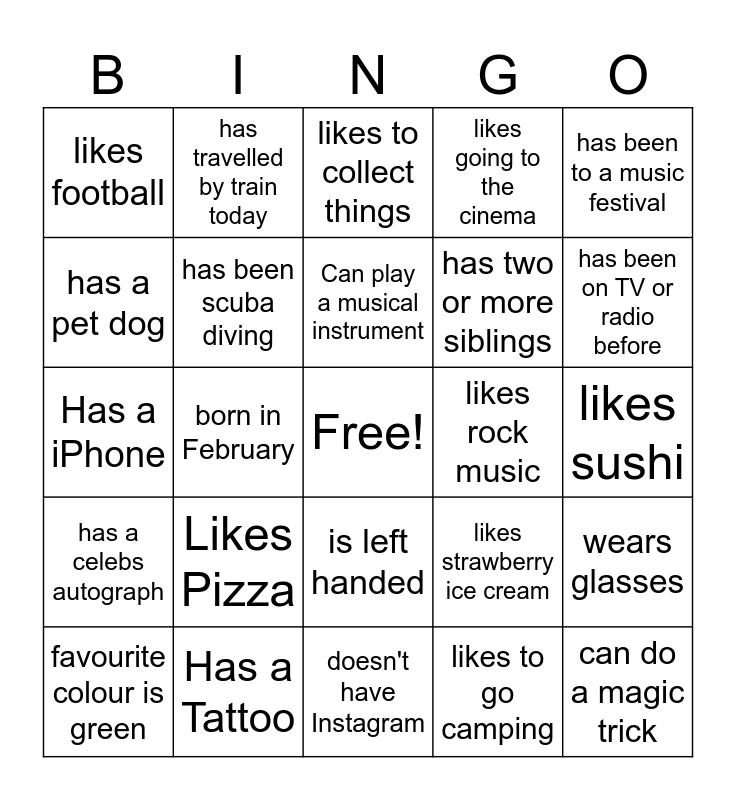 This bingo card has a free space and 24 words: Likes Pizza, Has a Tattoo, Can play a musical instrument, favourite colour is green, has been to a music festival, likes football, has a pet dog, has travelled by train today, likes rock music, is left handed, has two or more siblings, Has a iPhone, likes strawberry ice cream, wears glasses, has been scuba diving, likes to go camping, likes sushi, likes to collect things, has been on TV or radio before, born in February, can do a magic trick, has a celebs autograph, likes going to the cinema and doesn't have Instagram.
