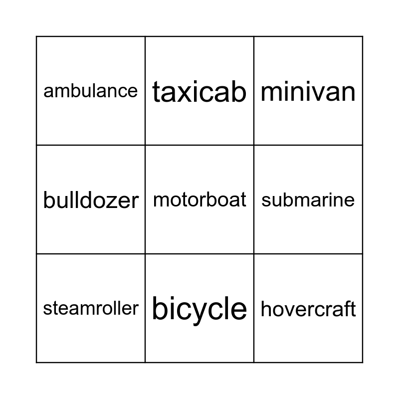 This bingo card has 10 words: bicycle, minivan, ambulance, motorboat, bulldozer, steamroller, taxicab, battleship, submarine and hovercraft.