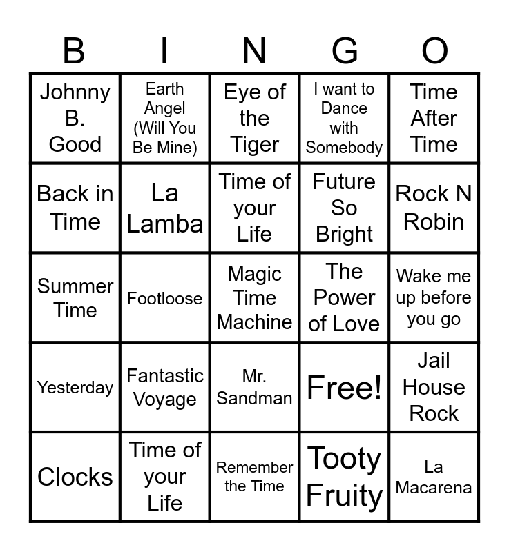 This bingo card has 25 words: Fantastic Voyage, Remember the Time, Time of your Life, Clocks, Time After Time, Johnny B. Good, Back in Time, Earth Angel (Will You Be Mine), The Power of Love, Mr. Sandman, Future So Bright, Summer Time, Free!, Jail House Rock, La Lamba, La Macarena, Wake me up before you go, Eye of the Tiger, Rock N Robin, Footloose, Magic Time Machine, Time of your Life, Yesterday, I want to Dance with Somebody and Tooty Fruity.