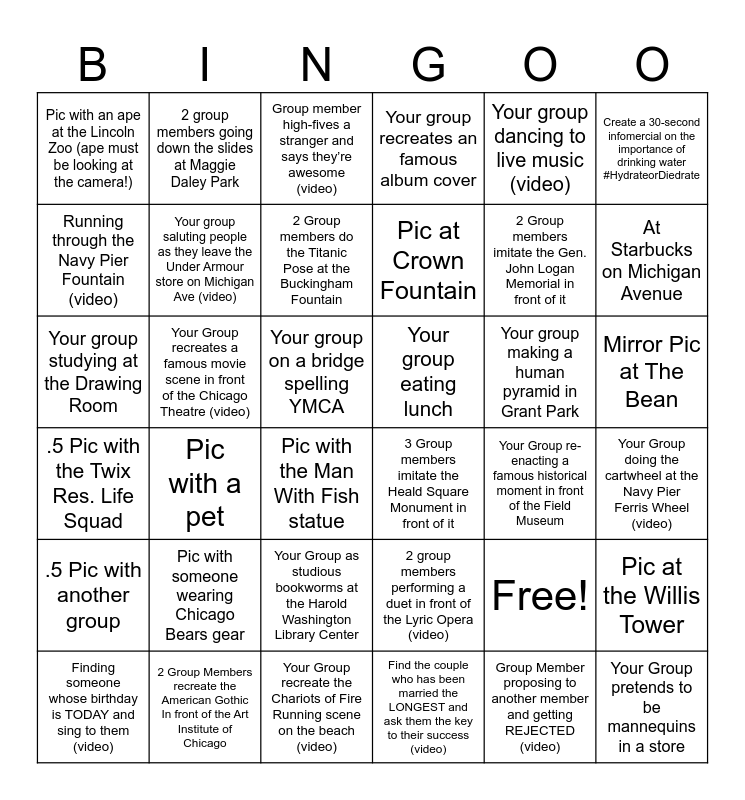 This bingo card has 37 words: Free!, 2 group members performing a duet in front of the Lyric Opera (video), Group Member proposing to another member and getting REJECTED (video), Running through the Navy Pier Fountain (video), Pic with a pet, Your group making a human pyramid in Grant Park, Your group saluting people as they leave the Under Armour store on Michigan Ave (video), Find the couple who has been married the LONGEST and ask them the key to their success (video), Your group dancing to live music (video), Finding someone whose birthday is TODAY and sing to them (video), At Starbucks on Michigan Avenue, Your group recreates an famous album cover, Your group studying at the Drawing Room, Your group on a bridge spelling YMCA, Create a 30-second infomercial on the importance of drinking water #HydrateorDiedrate, Your group eating lunch, Pic with someone wearing Chicago Bears gear, Group member high-fives a stranger and says they’re awesome (video), Mirror Pic at The Bean, Your Group recreates a famous movie scene in front of the Chicago Theatre (video), Pic with an ape at the Lincoln Zoo (ape must be looking at the camera!), Pic at Crown Fountain, Pic with the Man With Fish statue, Your Group re-enacting a famous historical moment in front of the Field Museum, 2 Group Members recreate the American Gothic In front of the Art Institute of Chicago, Your Group doing the cartwheel at the Navy Pier Ferris Wheel (video), 2 group members going down the slides at Maggie Daley Park, Your Group recreate the Chariots of Fire Running scene on the beach (video), Pic at the Willis Tower, Your Group as studious bookworms at the Harold Washington Library Center, Pic at The Picasso, 3 Group members imitate the Heald Square Monument in front of it, 2 Group members imitate the Gen. John Logan Memorial in front of it, .5 Pic with another group, .5 Pic with the Twix Res. Life Squad, 2 Group members do the Titanic Pose at the Buckingham Fountain and Your Group pretends to be mannequins in a store.