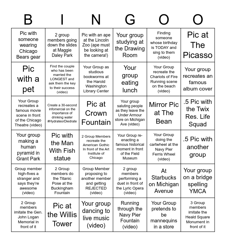 This bingo card has 36 words: 2 group members performing a duet in front of the Lyric Opera (video), Group Member proposing to another member and getting REJECTED (video), Running through the Navy Pier Fountain (video), Pic with a pet, Your group making a human pyramid in Grant Park, Your group saluting people as they leave the Under Armour store on Michigan Ave (video), Find the couple who has been married the LONGEST and ask them the key to their success (video), Your group dancing to live music (video), Finding someone whose birthday is TODAY and sing to them (video), At Starbucks on Michigan Avenue, Your group recreates an famous album cover, Your group studying at the Drawing Room, Your group on a bridge spelling YMCA, Create a 30-second infomercial on the importance of drinking water #HydrateorDiedrate, Your group eating lunch, Pic with someone wearing Chicago Bears gear, Group member high-fives a stranger and says they’re awesome (video), Mirror Pic at The Bean, Your Group recreates a famous movie scene in front of the Chicago Theatre (video), Pic with an ape at the Lincoln Zoo (ape must be looking at the camera!), Pic at Crown Fountain, Pic with the Man With Fish statue, Your Group re-enacting a famous historical moment in front of the Field Museum, 2 Group Members recreate the American Gothic In front of the Art Institute of Chicago, Your Group doing the cartwheel at the Navy Pier Ferris Wheel (video), 2 group members going down the slides at Maggie Daley Park, Your Group recreate the Chariots of Fire Running scene on the beach (video), Pic at the Willis Tower, Your Group as studious bookworms at the Harold Washington Library Center, Pic at The Picasso, 3 Group members imitate the Heald Square Monument in front of it, 2 Group members imitate the Gen. John Logan Memorial in front of it, .5 Pic with another group, .5 Pic with the Twix Res. Life Squad, 2 Group members do the Titanic Pose at the Buckingham Fountain and Your Group pretends to be mannequins in a store.
