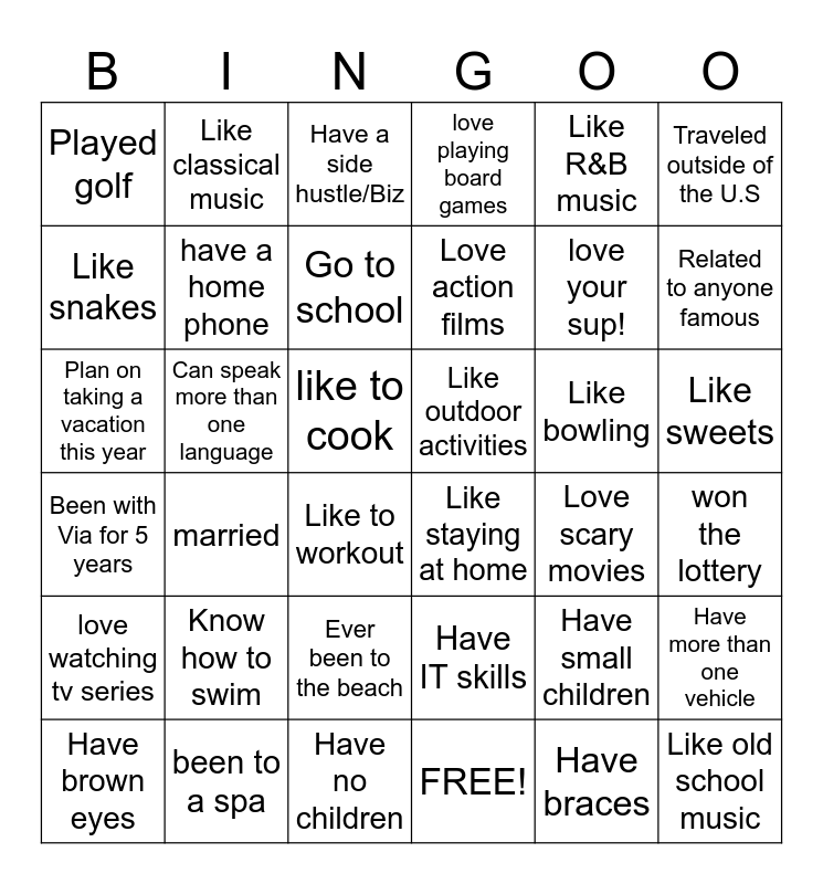 This bingo card has 36 words: Been with Via for 5 years, married, Have no children, Love action films, Like bowling, Like sweets, Played golf, been to a spa, Have a side hustle/Biz, Have IT skills, love your sup!, Traveled outside of the U.S, love watching tv series, Can speak more than one language, Go to school, love playing board games, Have small children, won the lottery, Like snakes, have a home phone, Like to workout, Like staying at home, Love scary movies, Have more than one vehicle, Plan on taking a vacation this year, Like classical music, like to cook, FREE!, Like R&B music, Related to anyone famous, Have brown eyes, Know how to swim, Ever been to the beach, Like outdoor activities, Have braces and Like old school music.