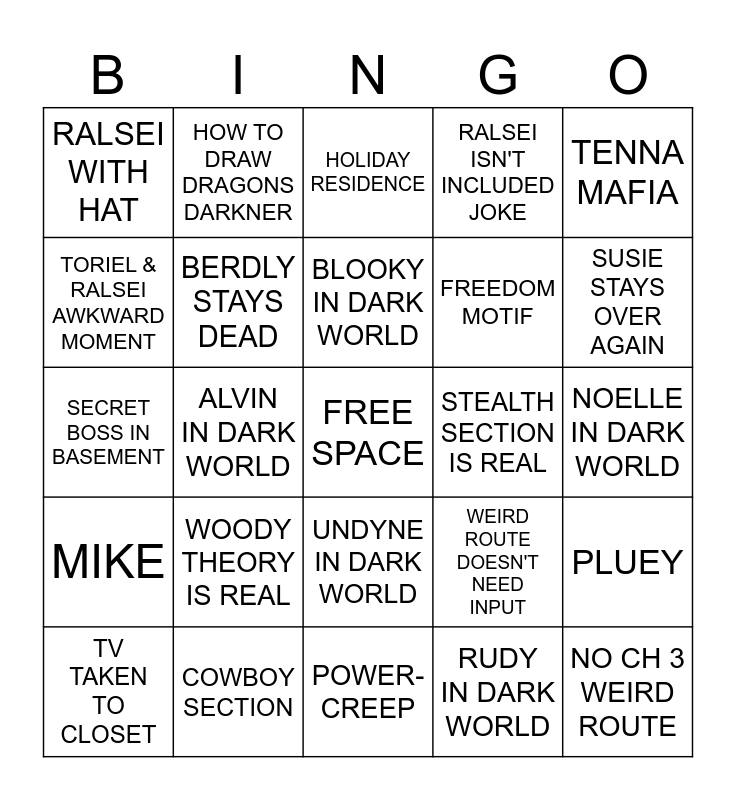 This bingo card has a free space and 24 words: WOODY THEORY IS REAL, COWBOY SECTION, BLOOKY IN DARK WORLD, TV TAKEN TO CLOSET, TENNA MAFIA, RALSEI WITH HAT, TORIEL & RALSEI AWKWARD MOMENT, HOW TO DRAW DRAGONS DARKNER, STEALTH SECTION IS REAL, UNDYNE IN DARK WORLD, FREEDOM MOTIF, SECRET BOSS IN BASEMENT, WEIRD ROUTE DOESN'T NEED INPUT, PLUEY, BERDLY STAYS DEAD, RUDY IN DARK WORLD, NOELLE IN DARK WORLD, HOLIDAY RESIDENCE, SUSIE STAYS OVER AGAIN, ALVIN IN DARK WORLD, NO CH 3 WEIRD ROUTE, MIKE, RALSEI ISN'T INCLUDED JOKE and POWER- CREEP.