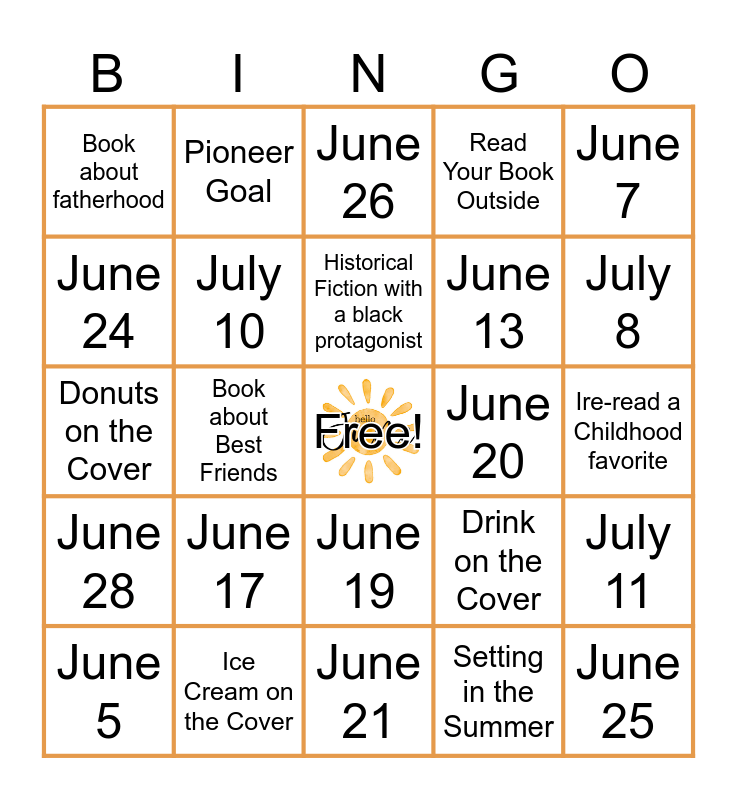 This bingo card has a free space and 46 words: June 12, June 19, July 9, June 18, June 24, June 17, June 26, June 6, July 8, June 5, July 10, June 13, June 25, June 28, June 4, July 12, June 20, July 11, June 14, Pioneer Goal, June 21, June 27, June 7, Book about fatherhood, LGBTQ author or protagonist, Historical Fiction with a black protagonist, Setting in the Summer, Book about Freedom, Donuts on the Cover, Book about Best Friends, Gifted to You, Published in June, Cover with all colors of the Rainbow, Road Trip, Ocean/Water Related, Buddy Read, Drink on the Cover, Revamp on a Classic, Someone Gets Married, Ice Cream on the Cover, Author you’ve read before, Read Your Book Outside, Ire-read a Childhood favorite, Book about World War 2, Book with sun on the cover and Graphic Novel.