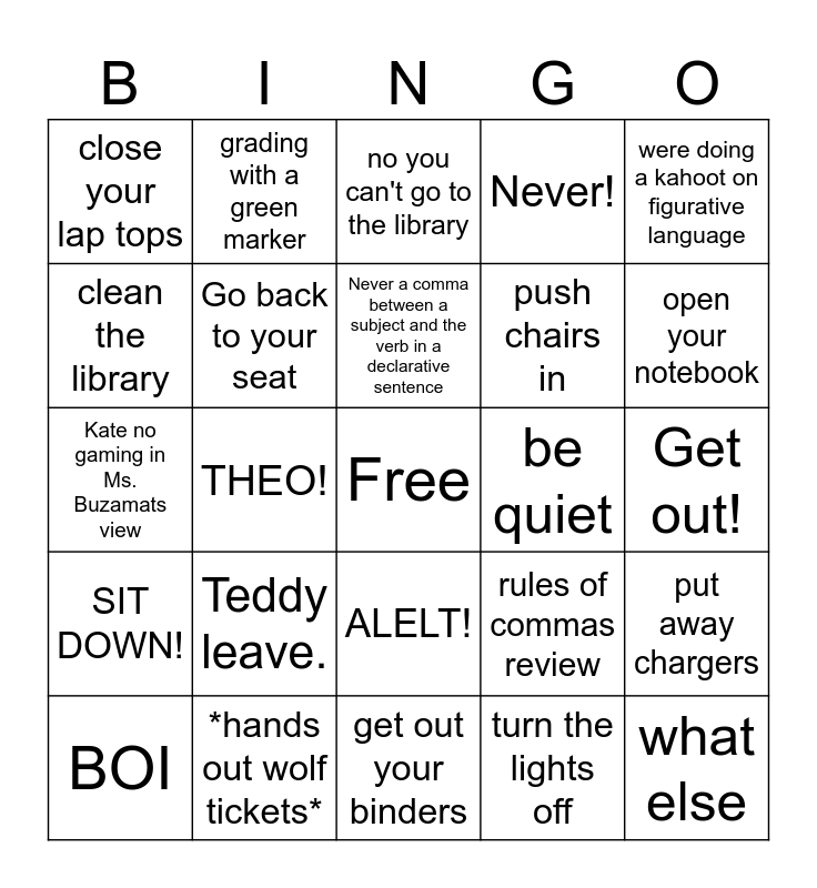 This bingo card has a free space and 24 words: BOI, Teddy leave., Never a comma between a subject and the verb in a declarative sentence, turn the lights off, were doing a kahoot on figurative language, close your lap tops, grading with a green marker, no you can't go to the library, be quiet, Get out!, Kate no gaming in Ms. Buzamats view, Go back to your seat, rules of commas review, put away chargers, clean the library, *hands out wolf tickets*, get out your binders, Never!, open your notebook, SIT DOWN!, THEO!, ALELT!, push chairs in and what else.