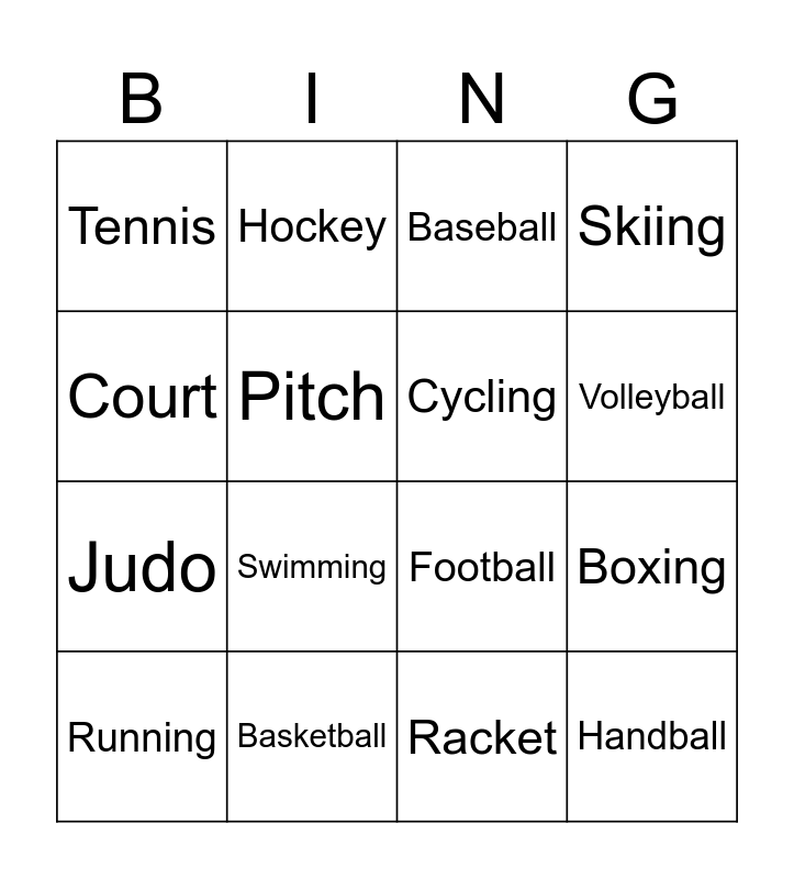This bingo card has 16 words: Basketball, Boxing, Baseball, Tennis, Judo, Hockey, Football, Racket, Court, Pitch, Running, Skiing, Swimming, Volleyball, Cycling and Handball.
