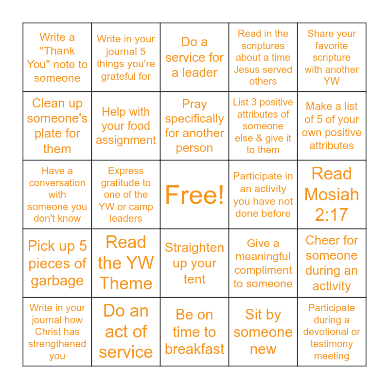 This bingo card has a free space and 24 words: Read the YW Theme, Do an act of service, Pray specifically for another person, Write in your journal how Christ has strengthened you, Share your favorite scripture with another YW, Write a "Thank You" note to someone, Clean up someone's plate for them, Write in your journal 5 things you're grateful for, Participate in an activity you have not done before, Straighten up your tent, List 3 positive attributes of someone else & give it to them, Have a conversation with someone you don't know, Give a meaningful compliment to someone, Cheer for someone during an activity, Help with your food assignment, Sit by someone new, Read Mosiah 2:17, Do a service for a leader, Make a list of 5 of your own positive attributes, Express gratitude to one of the YW or camp leaders, Participate during a devotional or testimony meeting, Pick up 5 pieces of garbage, Read in the scriptures about a time Jesus served others and Be on time to breakfast.