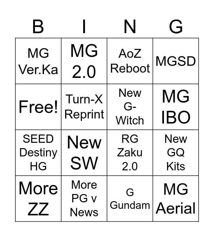 This bingo card has 16 words: More PG v News, New GQ Kits, AoZ Reboot, MG Ver.Ka, SEED Destiny HG, MG 2.0, RG Zaku 2.0, G Gundam, Free!, Turn-X Reprint, More ZZ, MGSD, New SW, MG IBO, New G-Witch and MG Aerial.