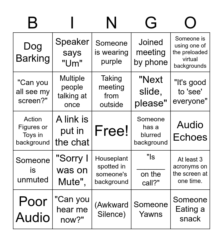 This bingo card has a free space and 24 words: "Sorry I was on Mute",, "Can you hear me now?", Taking meeting from outside, Poor Audio, Someone is using one of the preloaded virtual backgrounds, Dog Barking, "Can you all see my screen?", Speaker says "Um", Someone has a blurred background, Houseplant spotted in someone's background, "Next slide, please", Action Figures or Toys in background, "Is _______ on the call?", At least 3 acronyms on the screen at one time., Multiple people talking at once, Someone Yawns, Audio Echoes, Someone is wearing purple, "It's good to 'see' everyone", A link is put in the chat, Someone Eating a snack, Someone is unmuted, Joined meeting by phone and (Awkward Silence).