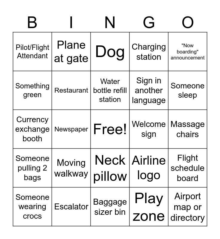 This bingo card has a free space and 24 words: Moving walkway, Escalator, Water bottle refill station, Someone wearing crocs, "Now boarding" announcement, Pilot/Flight Attendant, Something green, Plane at gate, Welcome sign, Neck pillow, Sign in another language, Currency exchange booth, Airline logo, Flight schedule board, Restaurant, Play zone, Massage chairs, Dog, Someone sleep, Newspaper, Airport map or directory, Someone pulling 2 bags, Charging station and Baggage sizer bin.
