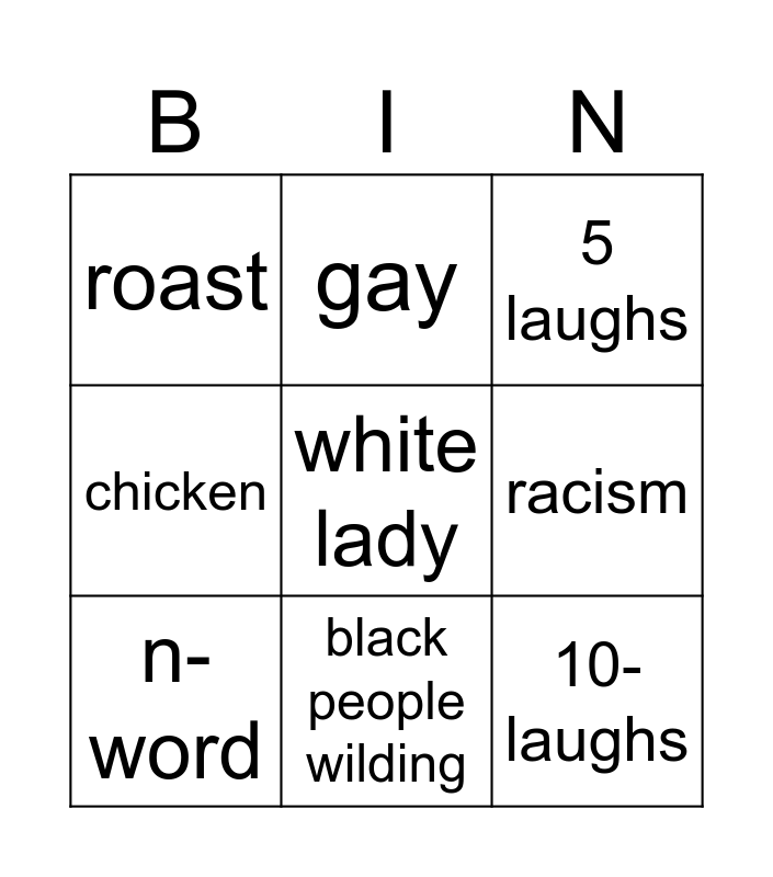 This bingo card has a free space and 8 words: racism, 5 laughs, gay, n- word, roast, 10- laughs, chicken and black people wilding.