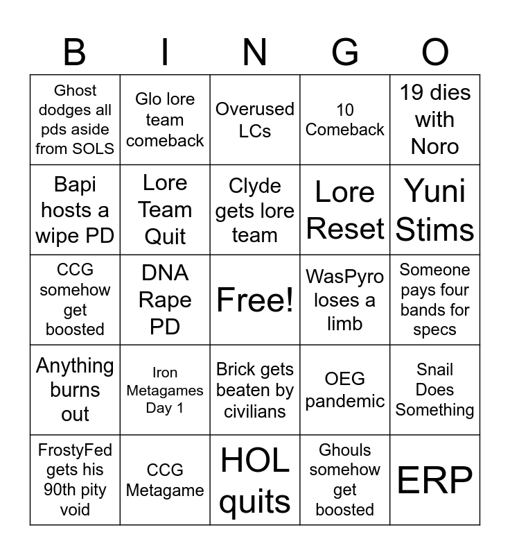 This bingo card has a free space and 24 words: Iron Metagames Day 1, CCG Metagame, Clyde gets lore team, FrostyFed gets his 90th pity void, 19 dies with Noro, Ghost dodges all pds aside from SOLS, Bapi hosts a wipe PD, Glo lore team comeback, WasPyro loses a limb, Brick gets beaten by civilians, Lore Reset, CCG somehow get boosted, OEG pandemic, Snail Does Something, Lore Team Quit, Ghouls somehow get boosted, Someone pays four bands for specs, Overused LCs, Yuni Stims, DNA Rape PD, ERP, Anything burns out, 10 Comeback and HOL quits.