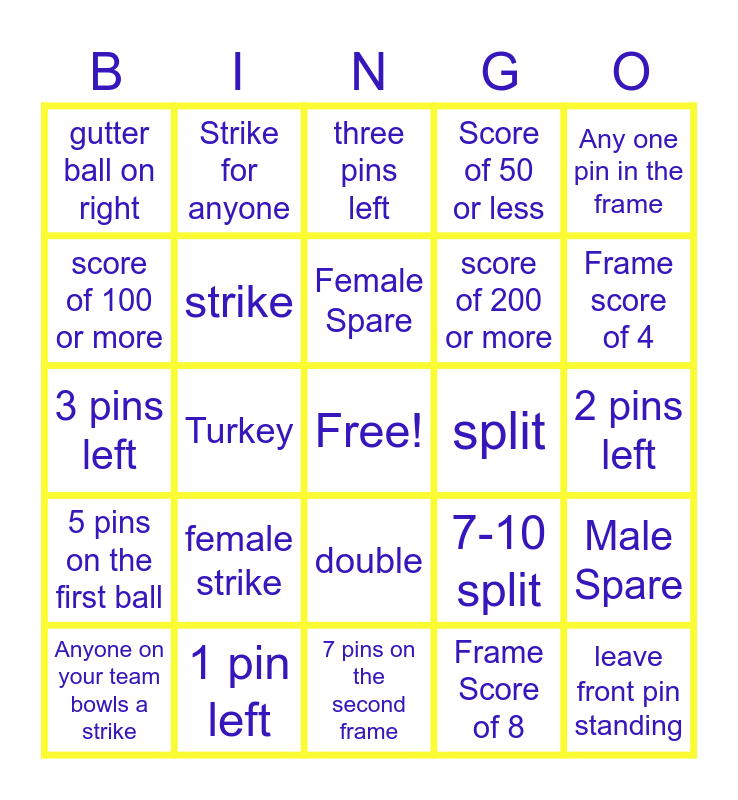 This bingo card has a free space and 29 words: Anyone on your team bowls a strike, Team member bowls a spare, Turkey, one pin remaining, gutter ball on right, three pins left, strike, female strike, split, 1 pin left, 2 pins left, leave front pin standing, 7 pins on the second frame, Frame Score of 8, Frame score of 4, gutter ball on left, double, 5 pins on the first ball, Any one pin in the frame, 3 pins left, 7-10 split, Frame score of 2, score of 200 or more, score of 100 or more, Score of 50 or less, Strike for anyone, Male Spare, Female Spare and Gutter Ball.