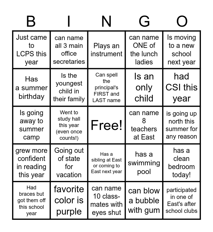 This bingo card has a free space and 24 words: Going out of state for vacation, favorite color is purple, Can spell the principal's FIRST and LAST name, Had braces but got them off this school year, Is moving to a new school next year, Just came to LCPS this year, Has a summer birthday, can name all 3 main office secretaries, can name 8 teachers at East, Has a sibling at East or coming to East next year, Is an only child, Is going away to summer camp, has a swimming pool, has a clean bedroom today!, Is the youngest child in their family, can blow a bubble with gum, is going up north this summer for any reason, Plays an instrument, had CSI this year, Went to study hall this year (even once counts!), participated in one of East's after school clubs, grew more confident in reading this year, can name ONE of the lunch ladies and can name 10 class- mates with eyes shut.
