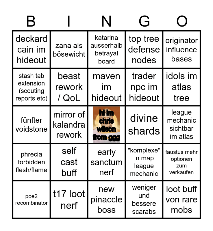 This bingo card has a free space and 24 words: self cast buff, t17 loot nerf, maven im hideout, poe2 recombinator, originator influence bases, deckard cain im hideout, stash tab extension (scouting reports etc), zana als bösewicht, divine shards, early sanctum nerf, trader npc im hideout, fünfter voidstone, "komplexe" in map league mechanic, faustus mehr optionen zum verkaufen, beast rework / QoL, weniger und bessere scarabs, league mechanic sichtbar im atlas, katarina ausserhalb betrayal board, idols im atlas tree, mirror of kalandra rework, loot buff von rare mobs, phrecia forbidden flesh/flame, top tree defense nodes and new pinaccle boss.