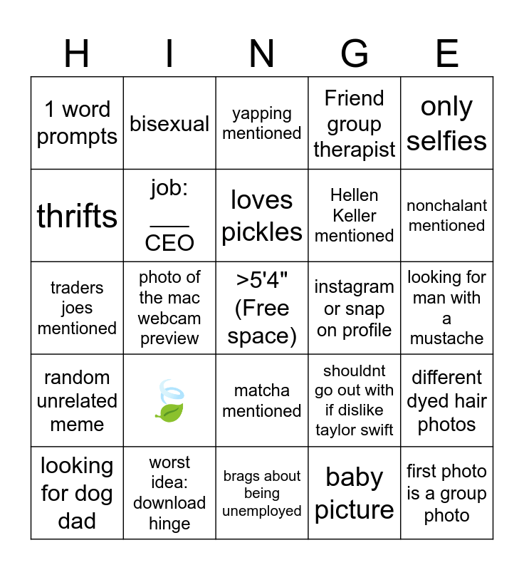 This bingo card has a free space and 24 words: 🍃, worst idea: download hinge, loves pickles, looking for dog dad, only selfies, 1 word prompts, thrifts, bisexual, instagram or snap on profile, matcha mentioned, Hellen Keller mentioned, traders joes mentioned, shouldnt go out with if dislike taylor swift, different dyed hair photos, job: ___ CEO, baby picture, looking for man with a mustache, yapping mentioned, nonchalant mentioned, photo of the mac webcam preview, first photo is a group photo, random unrelated meme, Friend group therapist and brags about being unemployed.