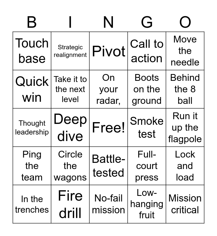 This bingo card has a free space and 24 words: Circle the wagons, Fire drill, On your radar,, In the trenches, Move the needle, Touch base, Quick win, Strategic realignment, Smoke test, Battle-tested, Boots on the ground, Thought leadership, Full-court press, Lock and load, Take it to the next level, Low-hanging fruit, Run it up the flagpole, Pivot, Behind the 8 ball, Deep dive, Mission critical, Ping the team, Call to action and No-fail mission.