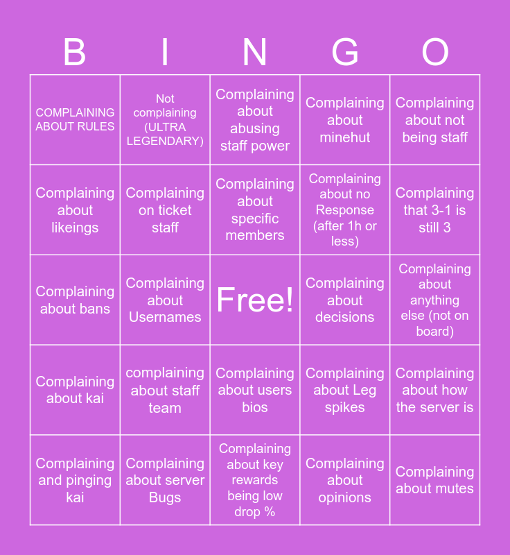 This bingo card has a free space and 24 words: complaining about staff team, Complaining about server Bugs, Complaining about specific members, Complaining and pinging kai, Complaining about not being staff, COMPLAINING ABOUT RULES, Complaining about likeings, Not complaining (ULTRA LEGENDARY), Complaining about decisions, Complaining about users bios, Complaining about no Response (after 1h or less), Complaining about bans, Complaining about Leg spikes, Complaining about how the server is, Complaining on ticket staff, Complaining about opinions, Complaining about anything else (not on board), Complaining about abusing staff power, Complaining that 3-1 is still 3, Complaining about Usernames, Complaining about mutes, Complaining about kai, Complaining about minehut and Complaining about key rewards being low drop %.