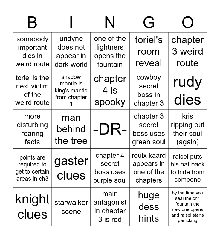 This bingo card has a free space and 24 words: gaster clues, starwalker scene, chapter 4 is spooky, knight clues, chapter 3 weird route, somebody important dies in weird route, toriel is the next victim of the weird route, undyne does not appear in dark world, chapter 3 secret boss uses green soul, chapter 4 secret boss uses purple soul, cowboy secret boss in chapter 3, more disturbing roaring facts, roulx kaard appears in one of the chapters, ralsei puts his hat back to hide from someone, shadow mantle is king's mantle from chapter 1, huge dess hints, kris ripping out their soul (again), one of the lightners opens the fountain, rudy dies, man behind the tree, by the time you seal the ch4 fountain the new one opens and ralsei starts panicking, points are required to get to certain areas in ch3, toriel's room reveal and main antagonist in chapter 3 is red.