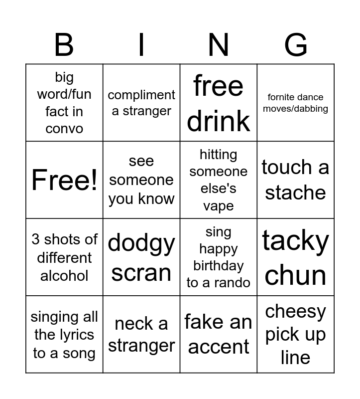 This bingo card has 16 words: neck a stranger, tacky chun, free drink, big word/fun fact in convo, 3 shots of different alcohol, compliment a stranger, sing happy birthday to a rando, fake an accent, Free!, see someone you know, singing all the lyrics to a song, fornite dance moves/dabbing, dodgy scran, touch a stache, hitting someone else's vape and cheesy pick up line.