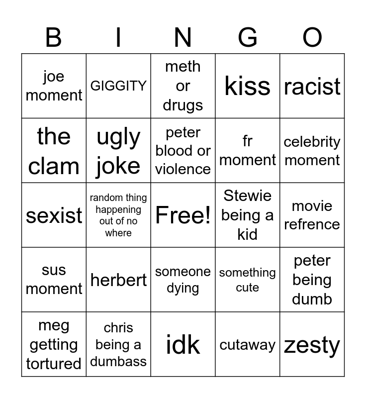 This bingo card has a free space and 24 words: herbert, chris being a dumbass, peter blood or violence, meg getting tortured, racist, joe moment, the clam, GIGGITY, Stewie being a kid, someone dying, fr moment, sexist, something cute, peter being dumb, ugly joke, cutaway, movie refrence, meth or drugs, celebrity moment, random thing happening out of no where, zesty, sus moment, kiss and idk.