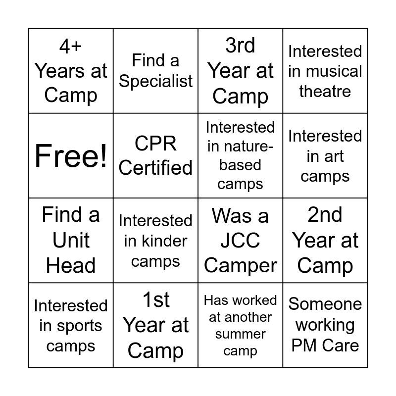 This bingo card has 16 words: 1st Year at Camp, 2nd Year at Camp, 3rd Year at Camp, 4+ Years at Camp, Find a Unit Head, Find a Specialist, Was a JCC Camper, Has worked at another summer camp, Free!, CPR Certified, Interested in sports camps, Interested in musical theatre, Interested in kinder camps, Interested in art camps, Interested in nature-based camps and Someone working PM Care.