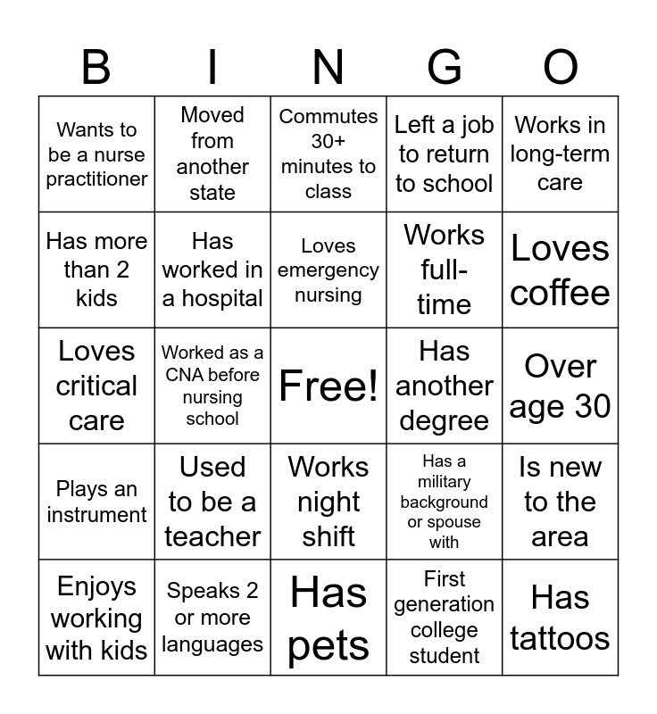 This bingo card has a free space and 30 words: Speaks 2 or more languages, Is a parent, Worked as a CNA before nursing school, Loves psych nursing, Wants to be a nurse practitioner, Commutes 30+ minutes to class, Has worked in a hospital, Works night shift, Has another degree, Has pets, Over age 30, Has tattoos, First generation college student, Loves pathophysiology, Loves coffee, Volunteers in the community, Has a military background or spouse with, Plays an instrument, Used to be a teacher, Works in long-term care, Loves critical care, Sporting KC fan, Moved from another state, Works full-time, Has more than 2 kids, Left a job to return to school, Is new to the area, Enjoys working with kids, Loves emergency nursing and Has traveled/lived internationally.