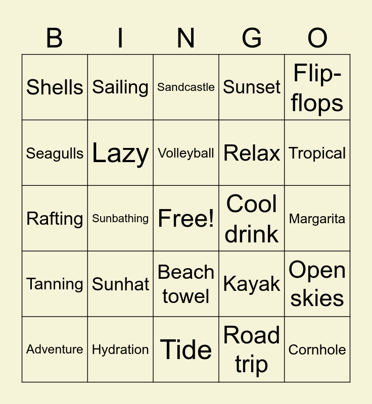 This bingo card has a free space and 103 words: Beach, Sunshine, Flip-flops, Ocean, Barbecue, Sunglasses, Lemonade, Swimsuit, Fireworks, Poolside, Sunburn, Ice cream, Watermelon, Tanlines, Breeze, Surfboard, Sandcastle, Coconut, Popsicle, Picnic, Seashell, Palm tree, Snorkel, Campfire, Hammock, Sunhat, Tropical, Sunset, Lifeguard, Sprinkler, Kayak, Road trip, Beachball, Cooler, Marshmallows, Bikini, Crickets, Dune, Volleyball, Hydration, Canoe, Tanning, Sunblock, Seagulls, Mango, Shells, Grill, Cornhole, Hotdog, Kite, Boardwalk, Jet ski, Lake, Tan, Sunscreen, Boogie board, S’mores, Concerts, Festival, Beach towel, Margarita, Travel, Shorts, Freedom, Fireflies, Camping, Paddleboard, Sailing, Rafting, Sunbathing, Tide, Fishing, Bonfire, Lounge, Cabana, Pineapple, Slushie, Adventure, Sand, Cocktails, Getaway, Island, Lazy, Staycation, Cool drink, Bike ride, Splash, Shell collecting, Palm leaves, Waves, Paddle, Sun-kissed, Open skies, Backyard, Grilling, Skateboard, Relax, Laughter, Heatwave, Sunrise, Lawn games, Barefoot and Beach breeze.